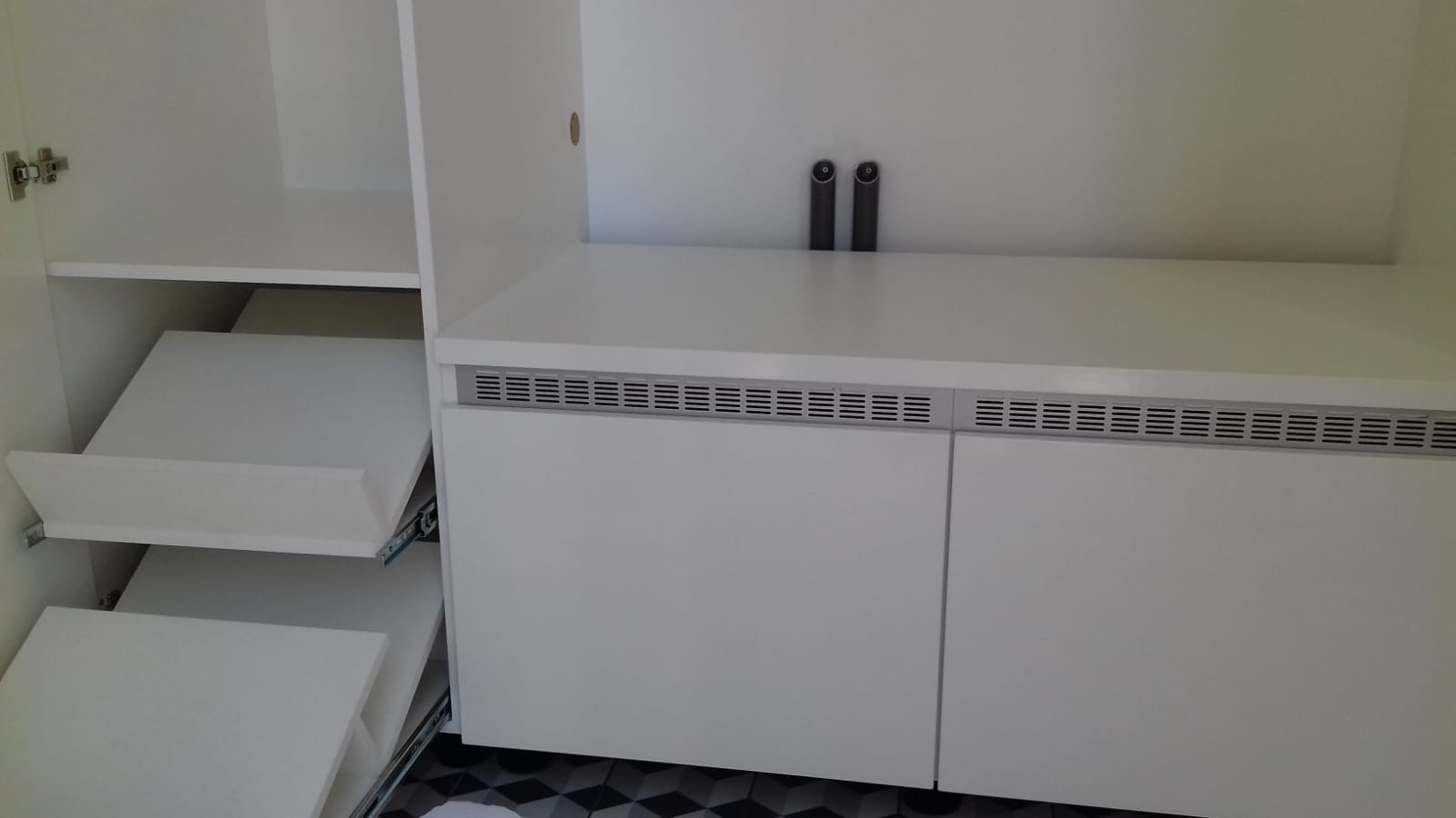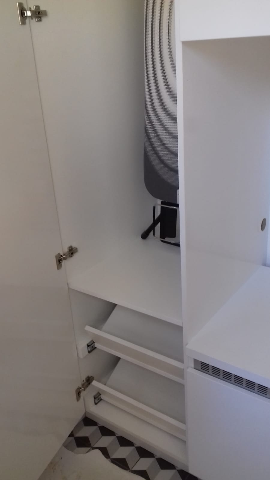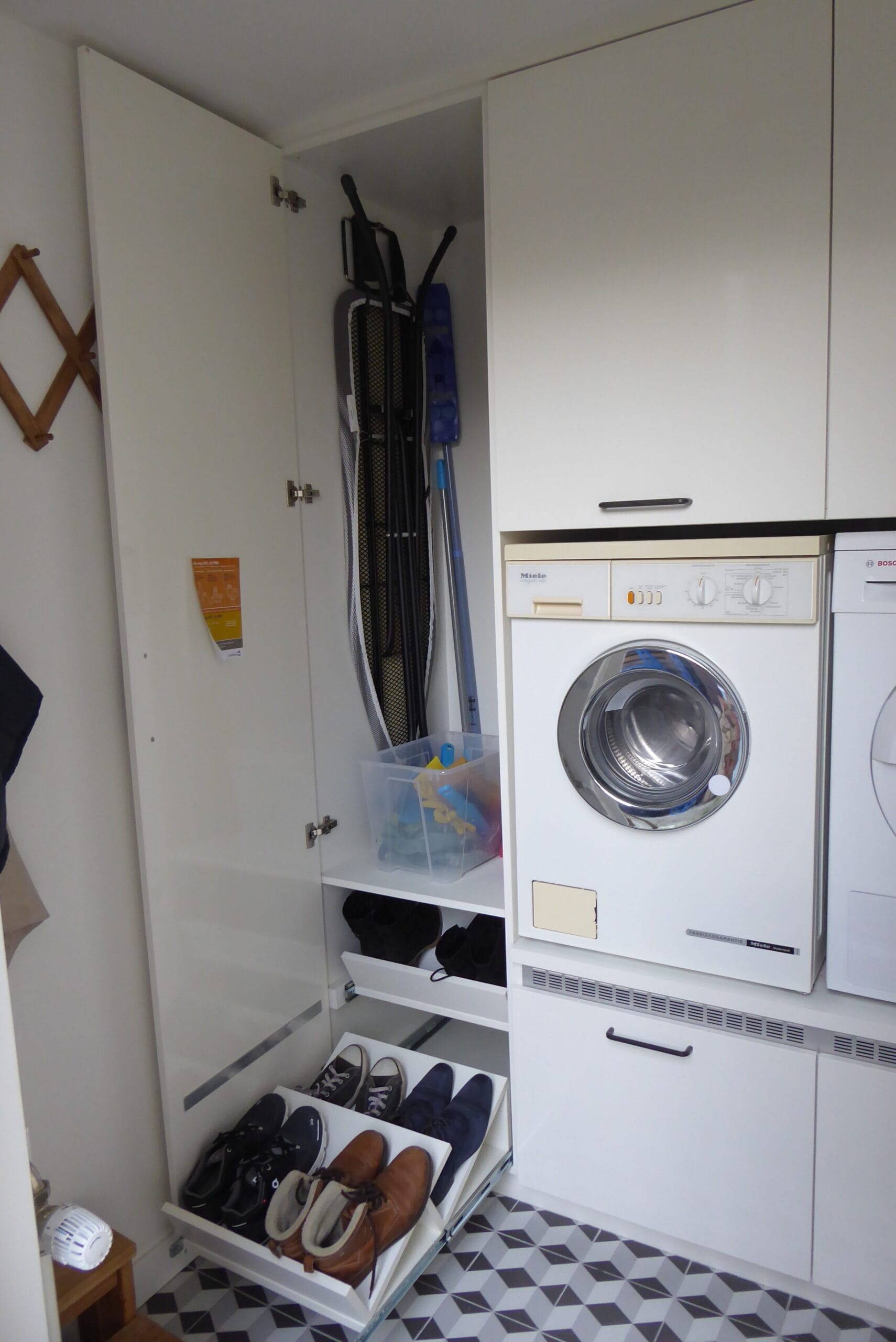 De wasmachine en droger zijn grote apparaten die je liever uit het zicht hebt. Voor deze klant hebben we een op maat gemaakt meubel ontworpen dat de apparaten netjes wegwerkt, op hoogte plaatst voor gemakkelijk gebruik, en extra opbergruimte creëert rondom de machines. Het meubel biedt ruimte voor het opbergen van onder andere de strijkplank en schoenen, zodat alles een eigen plek heeft en de ruimte er netjes uitziet.