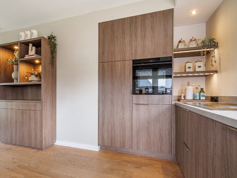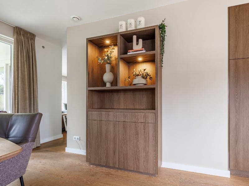 Met deze combinatie van een maatwerkkeuken en vrijstaande kast ontstaat een uniek interieur dat volledig is afgestemd op de wensen van de bewoners. Praktisch in gebruik en sterk in uitstraling.