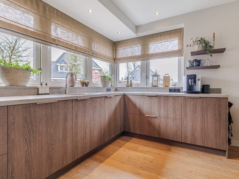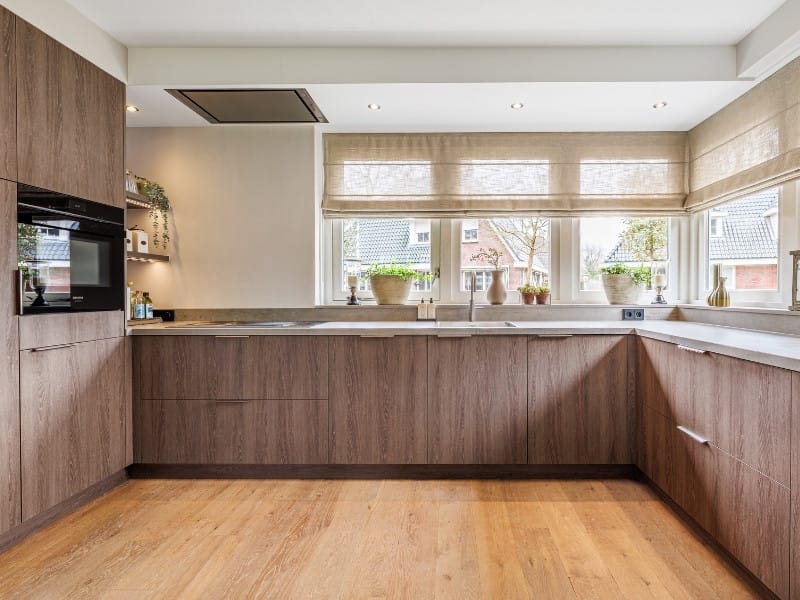 Er is gekozen voor duurzame en hoogwaardige materialen die niet alleen zorgen voor een luxe uitstraling, maar ook voor langdurig gebruiksgemak. De combinatie van warme tinten en moderne afwerking geeft de ruimte een tijdloos karakter.